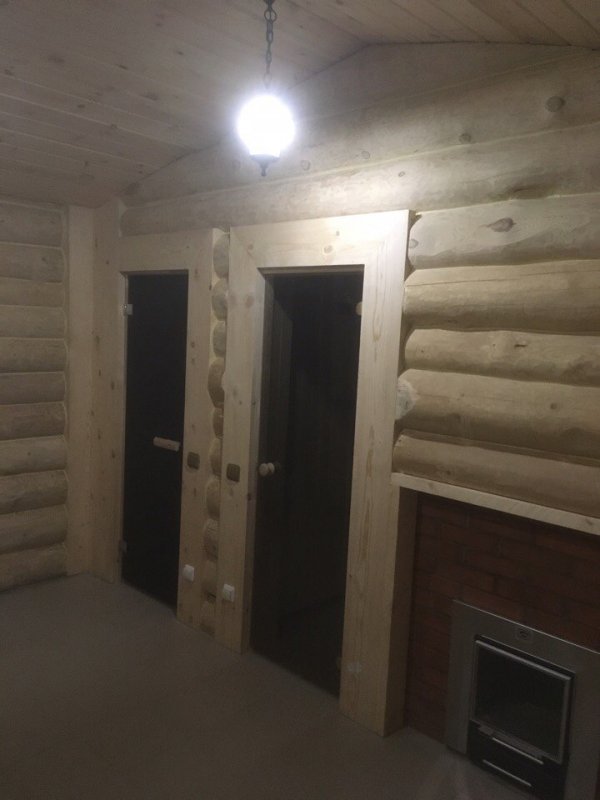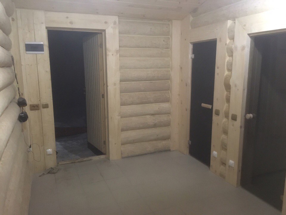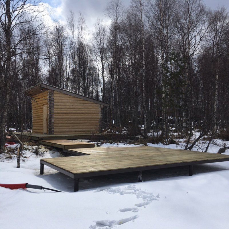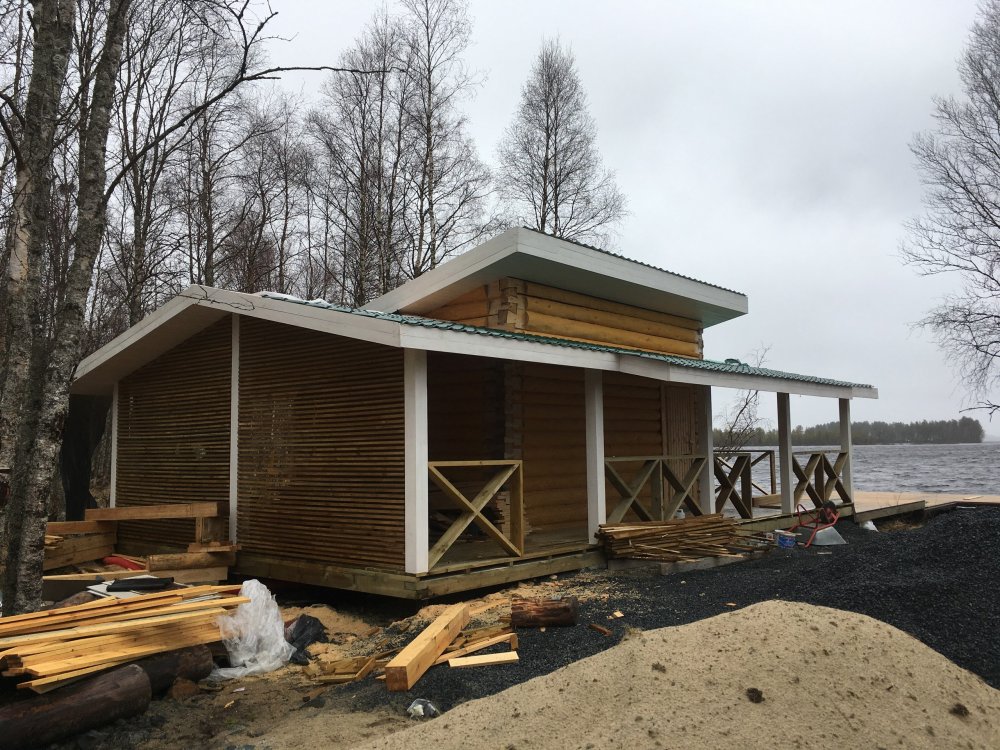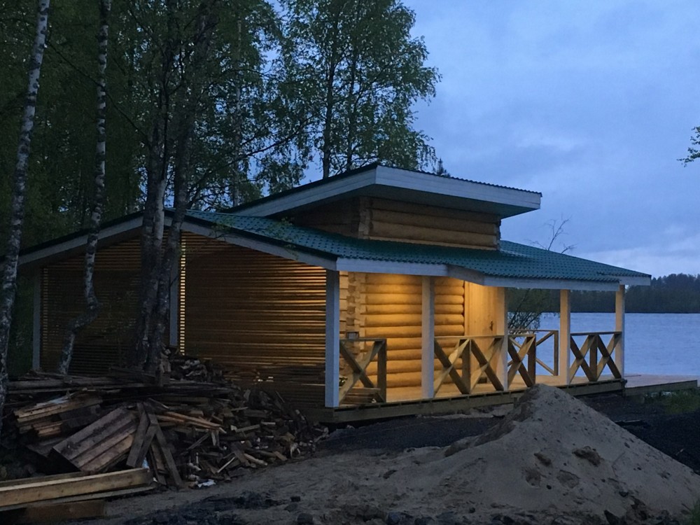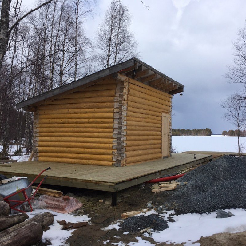 Баня на монолитной железобетонной плите из бревна с двумя пристройками террасой размером 6*3 м2 и дровяником 6*3 м2.