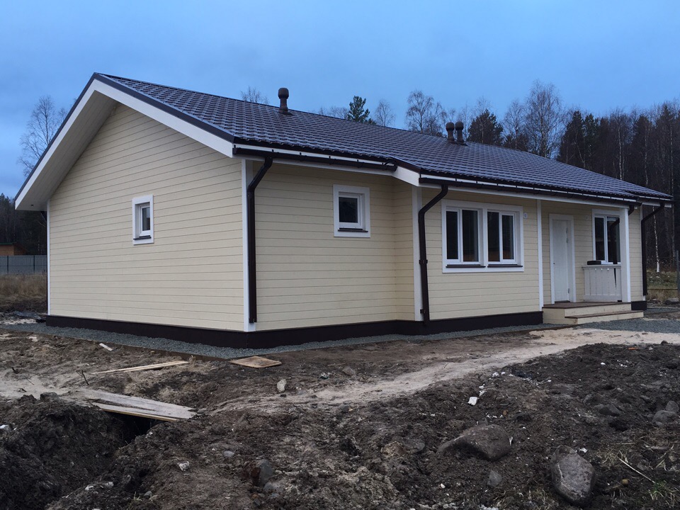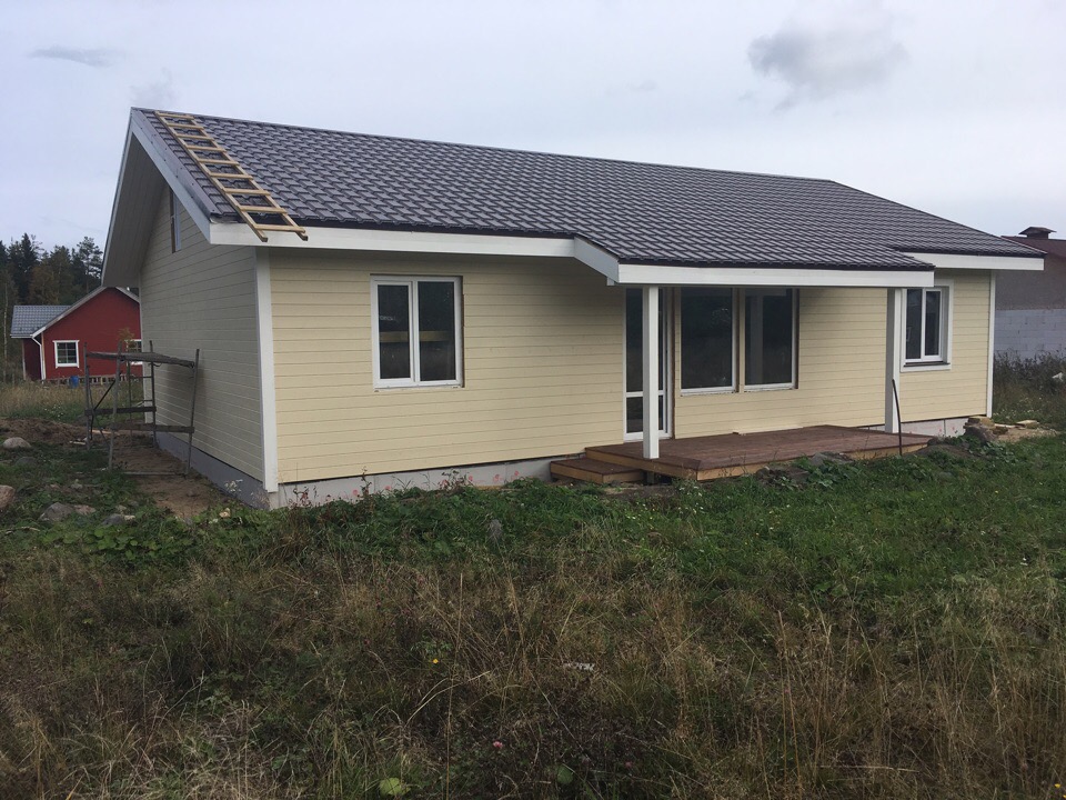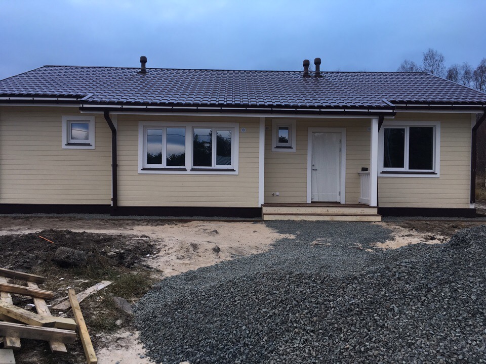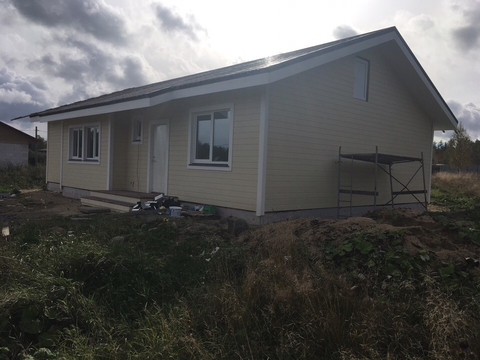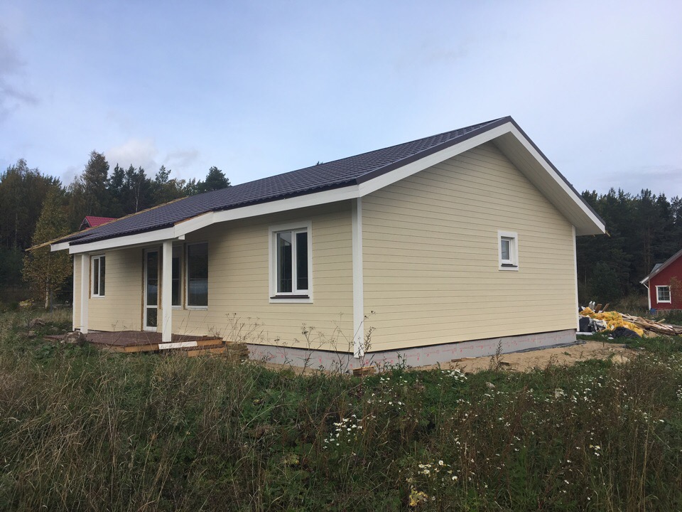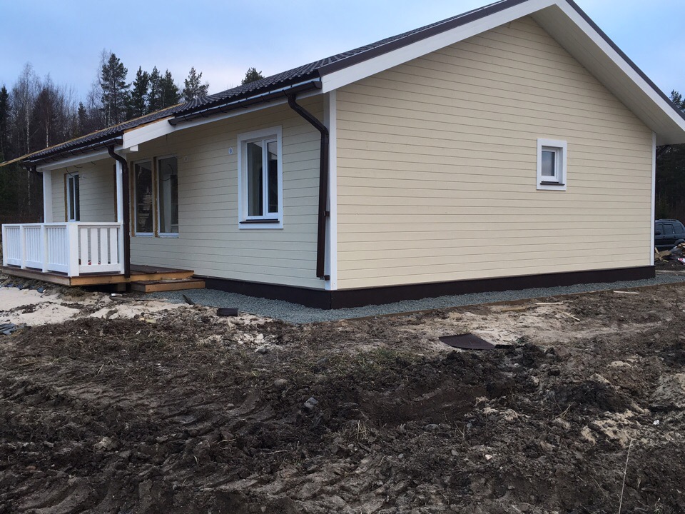 Дом построен на ленточном фундаменте по каркасной технологии. Сделаны отливы, терраса, крыльцо.
